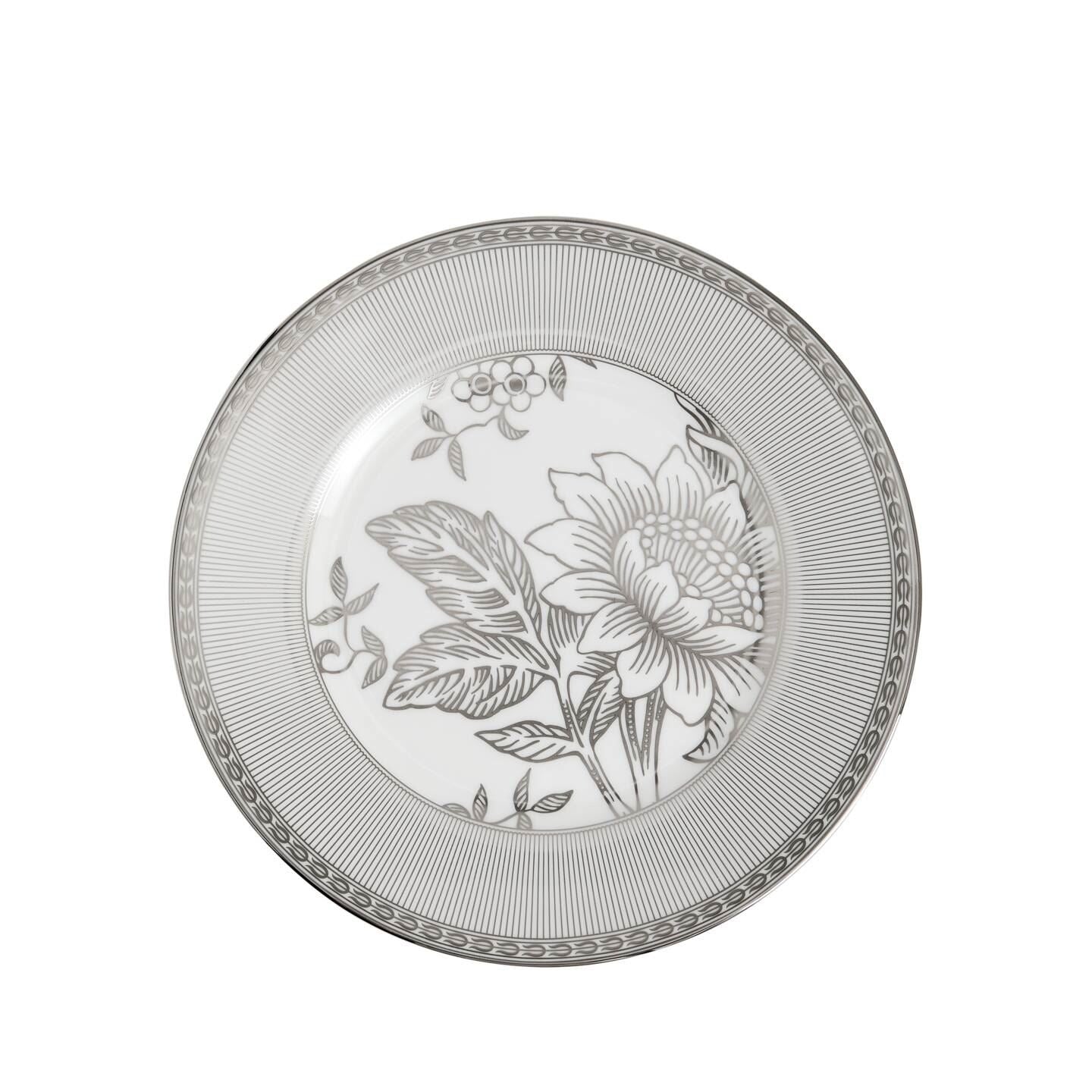 Refine your table setting with the Silver Tonquin Plate. Crafted from fine bone china, this elegant plate features intricate platinum accents that add a touch of sophistication to any meal. Perfect for both casual and formal dining, it combines classic beauty with modern elegance.