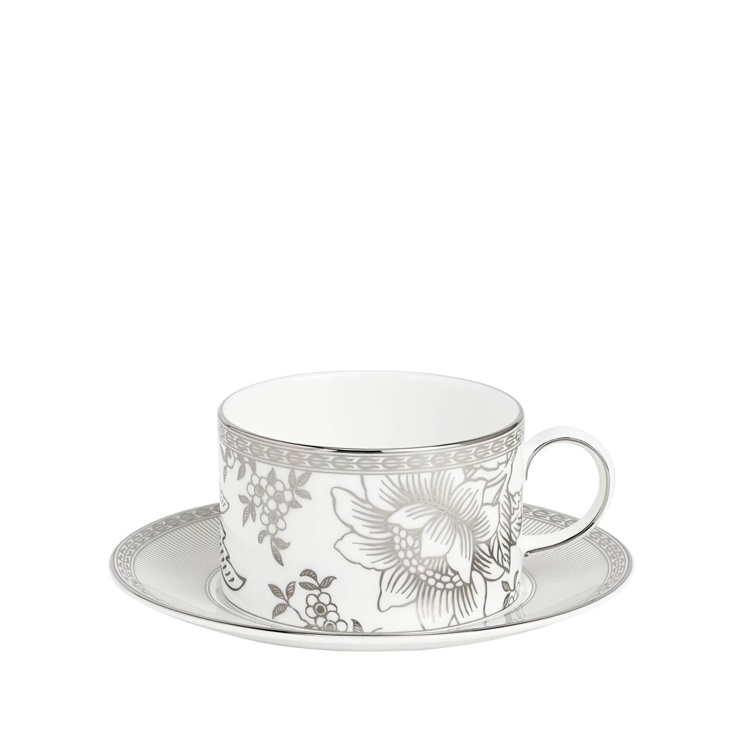 Savor every sip with the Silver Tonquin Teacup and Saucer. Crafted from fine bone china, this elegant set features intricate platinum detailing that adds a touch of sophistication to your tea time. Perfect for both everyday use and special occasions, it exudes luxury and refinement.