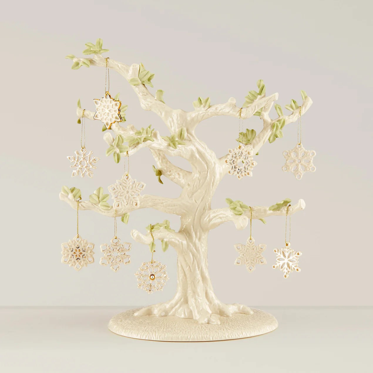 Perfect for the winter season, this porcelain tree comes complete with 10 mini snowflake ornaments for decorating. Each pristine snowflake is cut in one-of-a-kind shapes to make them truly unique.
