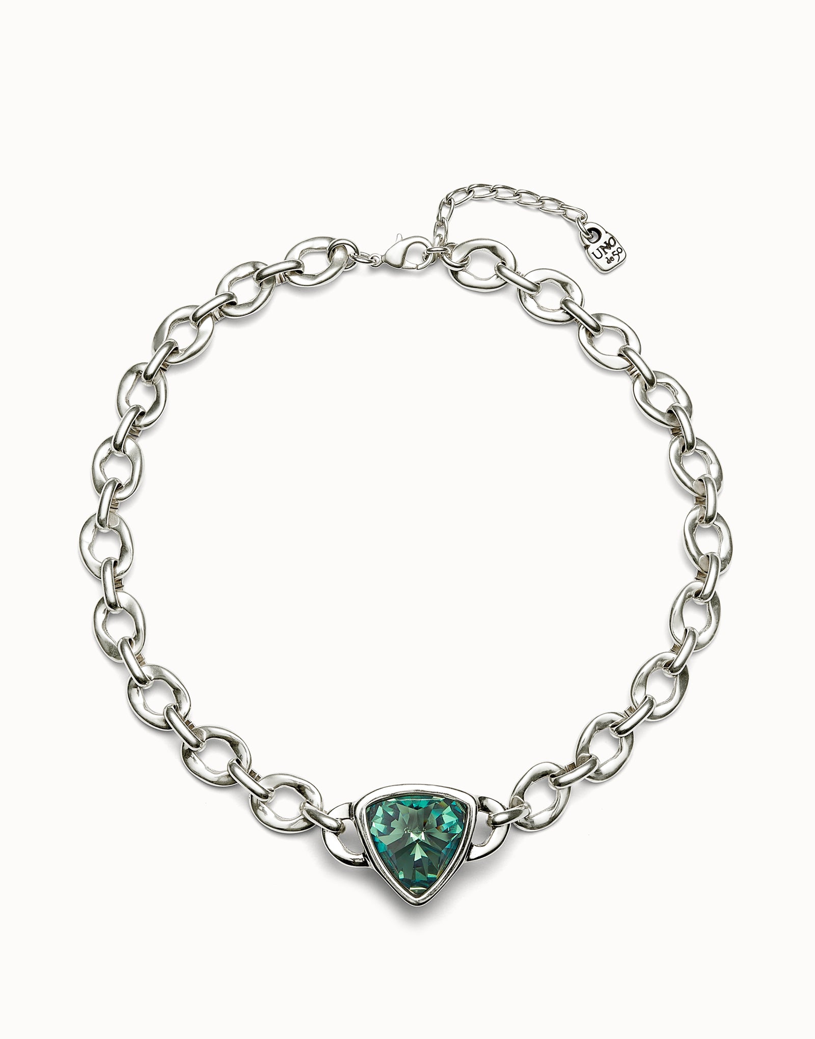 Sterling silver-plated link pendant with a large central green faceted crystal.Ser camaleónica is to adapt to everything with talent, while still being you. Is being versatile, resilient and always ready to reinvent yourself. Let your jewelry become a kaleidoscopic and change color. Nobody gets bored with you. Bring fun and dynamism to life. Like the fresh touch of the faceted crystal pieces that play with dimensions. The time to Ser camaleónica is now.