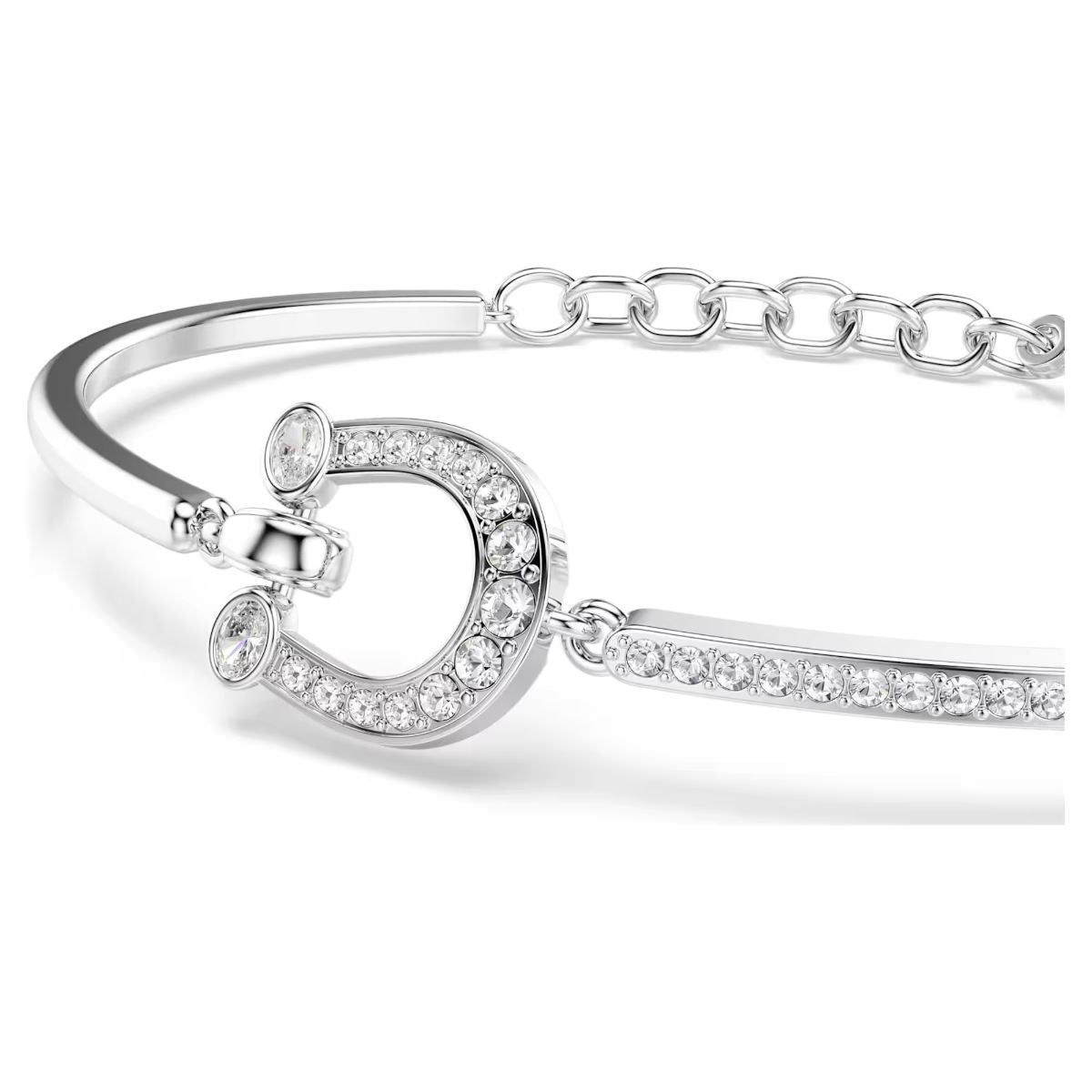 Symbolizing ambition and momentum, this rhodium plated bangle features a horseshoe at the center, while the articulated band includes an adjustable chain to ensure a comfortable and personalized fit. Wear this bangle as your own lucky charm or gift it to someone to inspire swift success.