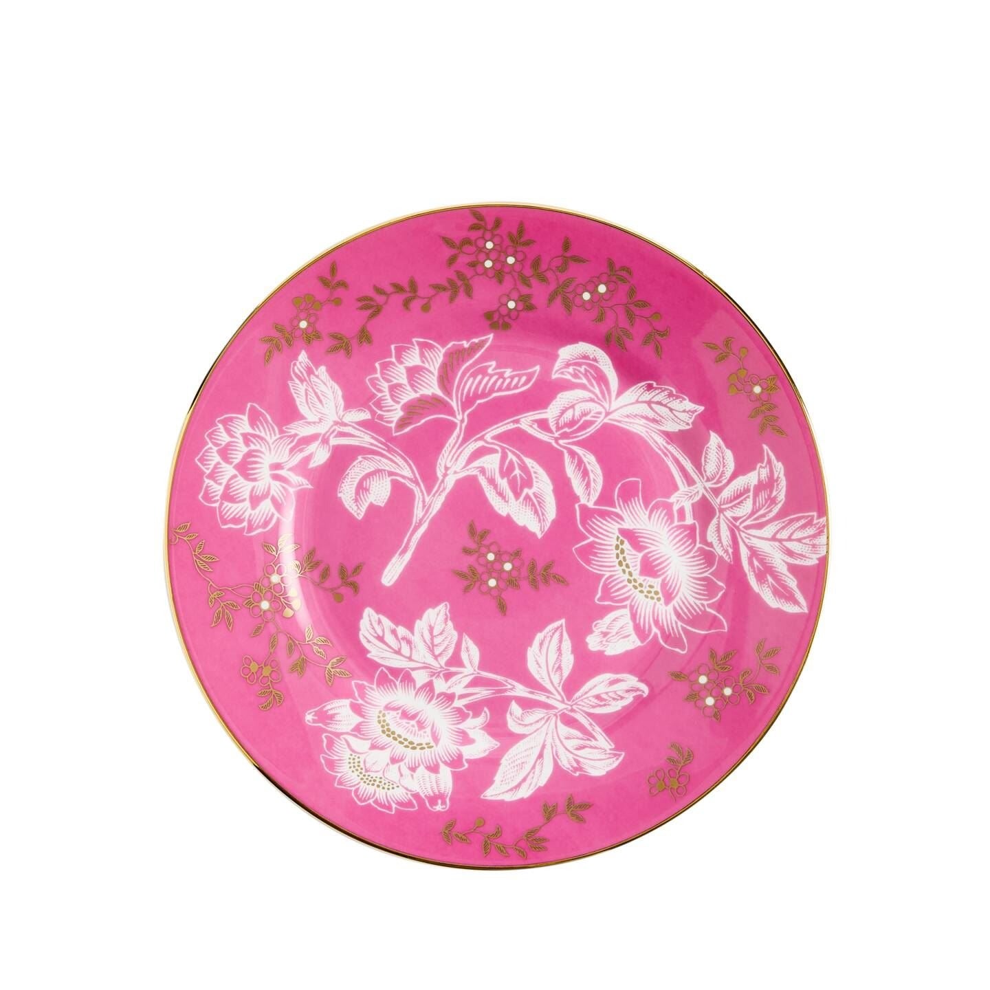 This Pink Tonquin plate is ideal for any lover of the colourful and the flamboyant. A historic pattern revived and reimagined for today, each piece is crafted in fine bone china and finished in 22-carat lining for a glittering luxury finish.