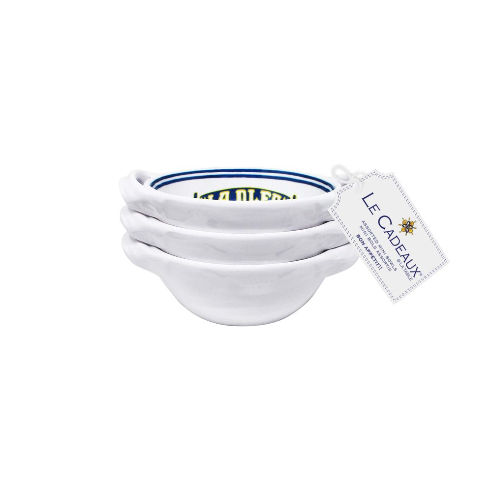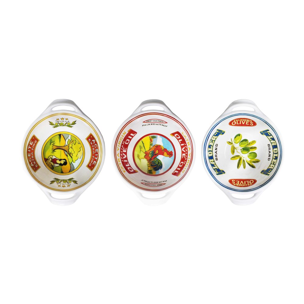 Super fun and cute, sold in a set of three tied with bow and tag for effortless gift-giving! So versatile and so many uses; food prep bowls, small side bowls for each place setting, cocktail party nuts, olives, hummus and other dips. BPA free 100% melamine, shatter resistant and dishwasher safe, top and bottom rack, as with all melamine, not recommended for microwave.