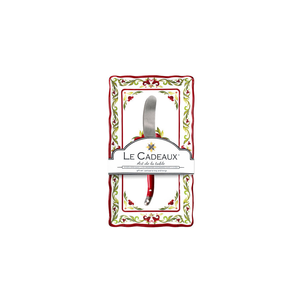 Our festive Holiday Vischio butter dish with laguiole spreader is both versatile and wrapped ready for gifting! Not just for butter, it multi tasks well for other small serving needs such as pâté, single cheese and other small appetizer needs. Pairs back with all our Vischio dinnerware and serving pieces as well as solid red Garnet collection. BPA Free 100% melamine, shatter-resistant and dishwasher safe, top and bottom rack, as with all melamine, not recommended for microwave. Product includes one Butter Dish with dimensions 7.5” x 4” and one laguiole butter spreader.