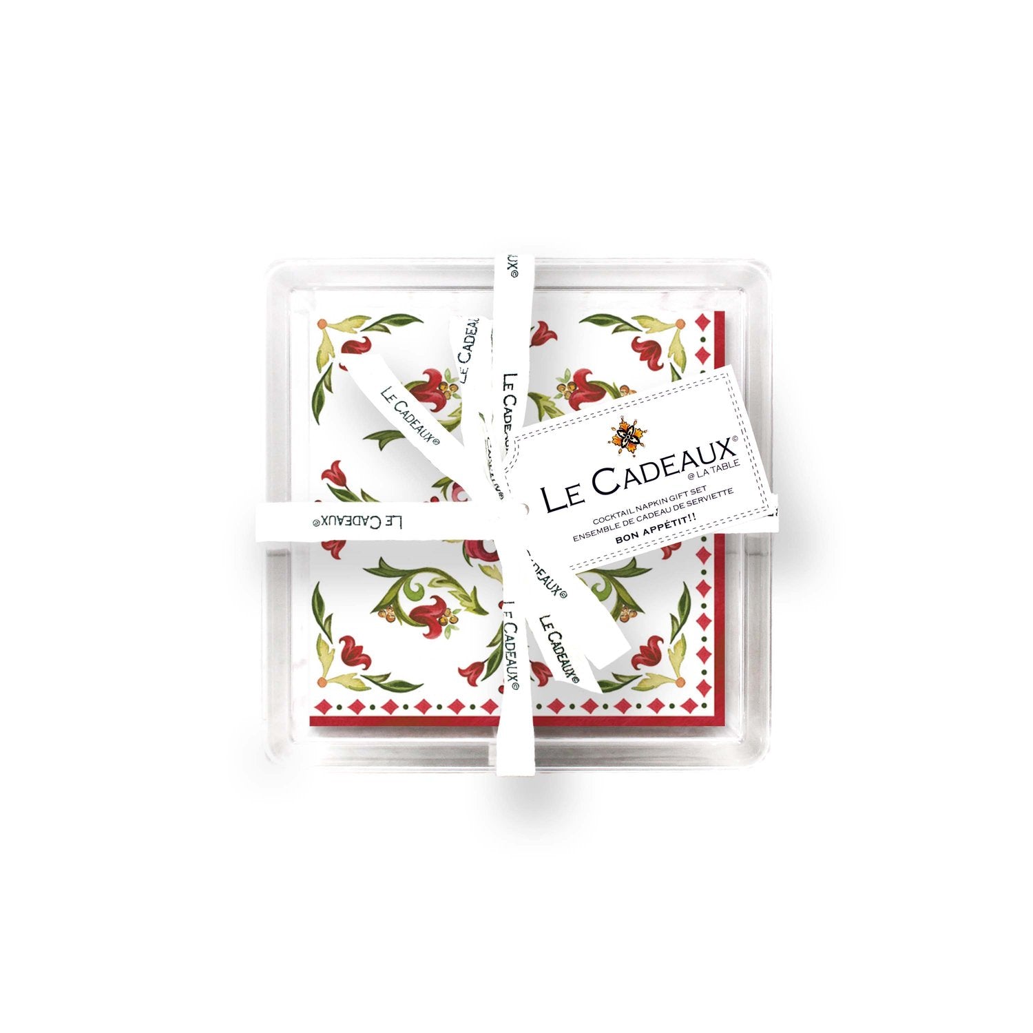 This chic gift set with 30 Vischio cocktail napkins in a heavy weight clear acrylic holder is already ribbon tied and tagged to make your gift giving effortless! The napkin set pairs beautifully with the Vischio dinnerware and gift set collections or makes a great "on its own" gift set for any occasion. Our soft touch napkins are made of the finest quality 100% wooden pulp virgin tissue and are chlorine free. Product includes 1 x pack of 30 Cocktail Napkins with dimensions 5" x 5" - 10” by 10” when opened and 1 x acrylic holder with dimensions 6” wide by 2” tall.