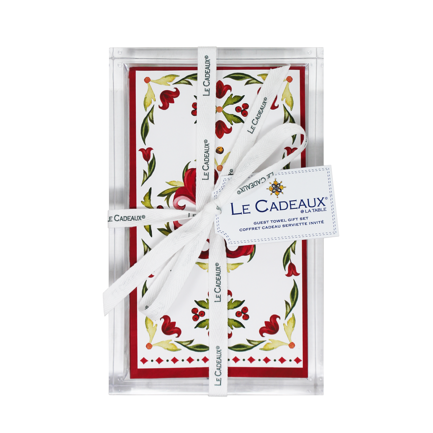 This chic gift set with 15 Vischio guest/buffet napkins in a heavy weight clear acrylic holder is already ribbon tied and tagged to make your gift giving effortless! The perfect companion for your Holiday gatherings, our Vischio guest/buffet napkins pair beautifully with our Vischio and Garnet Holiday dinnerware and gift set collections but also make a festive stand alone statement at any holiday party! Our soft touch napkins are made of the finest quality 100% wooden pulp virgin tissue. Product includes 1 x pack of 15 Guest Towel/Buffet Napkins with dimensions 4.25" x 7.75" - 12.75” by 15.75” when opened and 1 x acrylic holder with dimensions 5.5” wide by 2” tall.