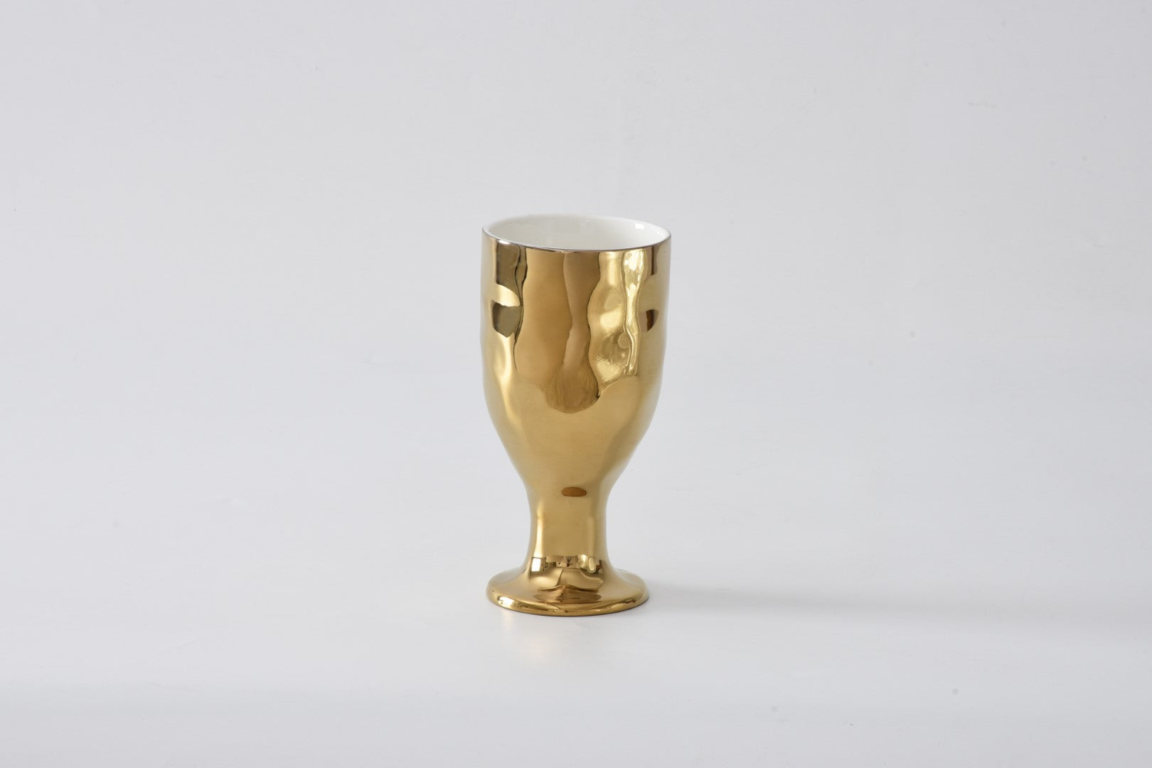 Happy hour just got even happier. Enjoy your favorite wines or cocktails in our beautiful Wine Goblet from our Accessories Collection. The perfect additions to your home bar or can be gifted to the wine enthusiast who loves to entertain. Handcrafted in striking high-fired white porcelain combine with an elegant metallic gold finished outside. Freezer Safe. Food safe. Dishwasher safe. Easy Care. Capacity: 12 oz.