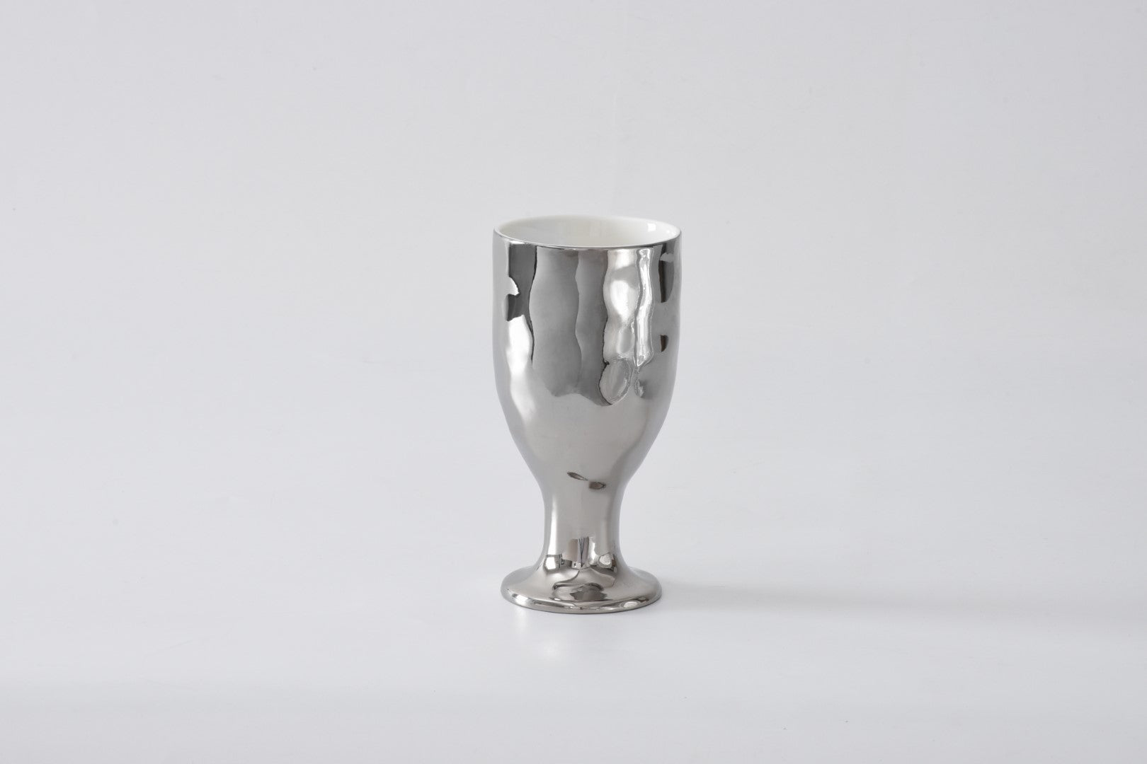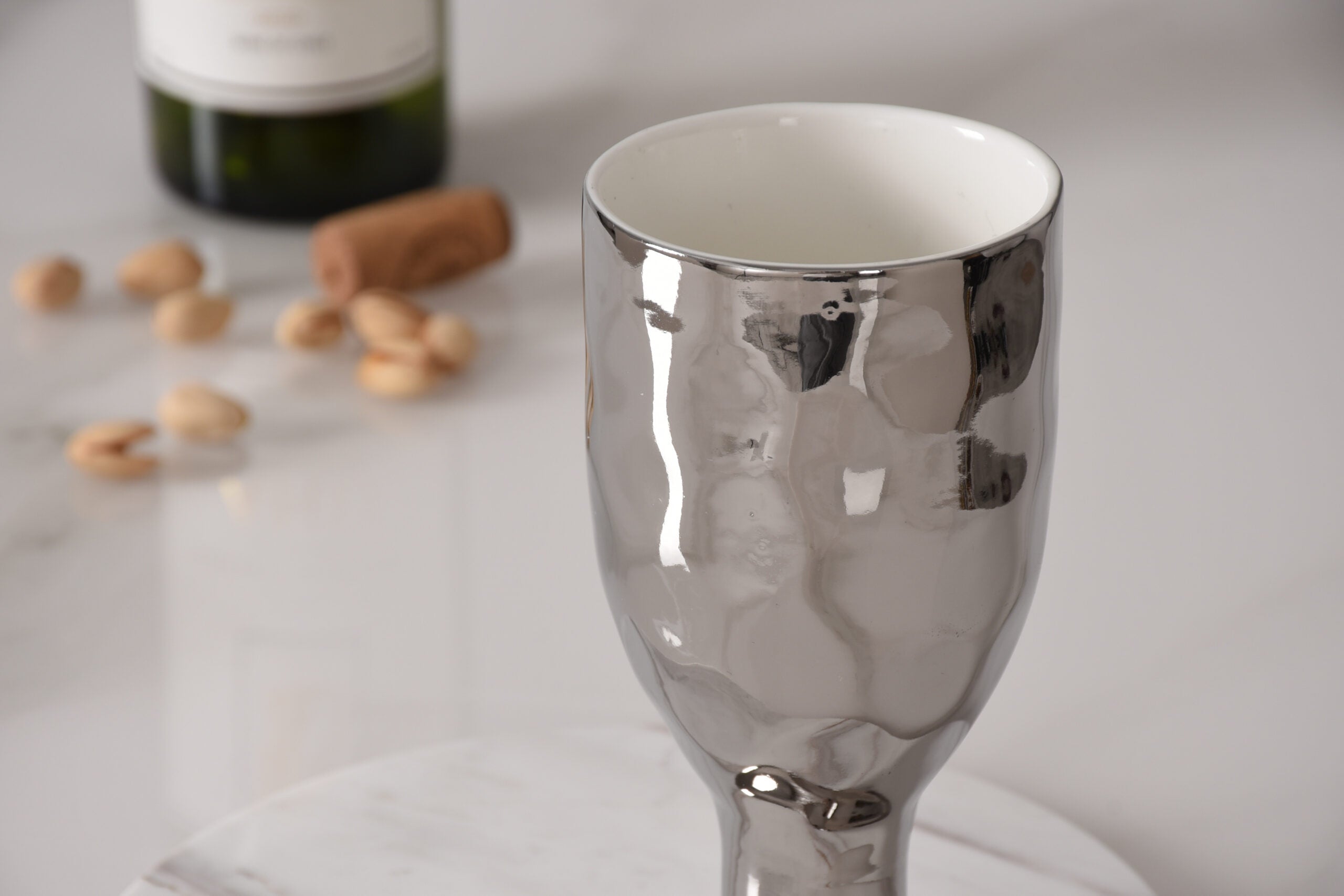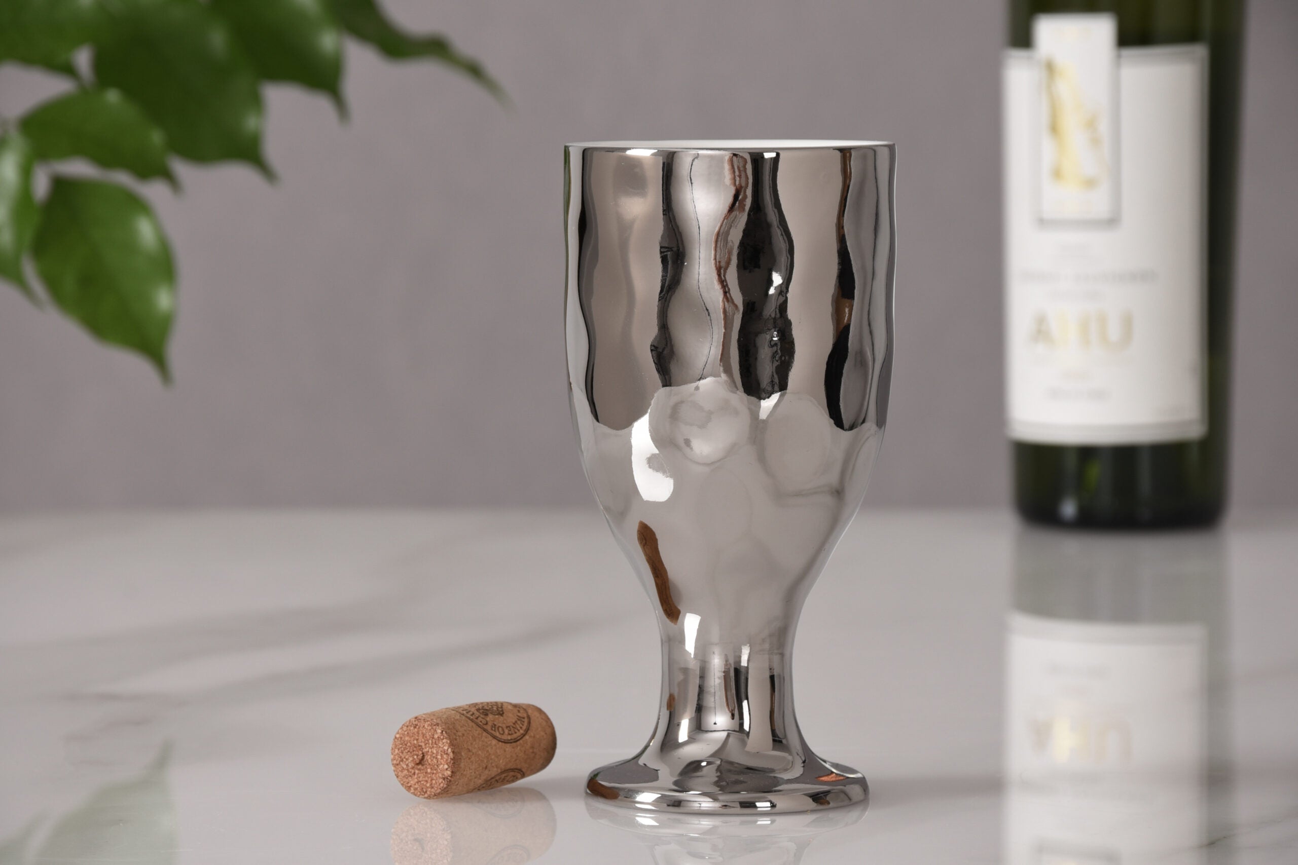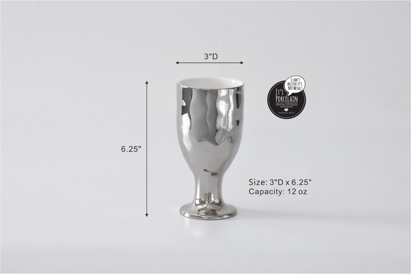 Happy hour just got even happier. Enjoy your favorite wines or cocktails in our beautiful Wine Goblet from our Accessories Collection. The perfect additions to your home bar or can be gifted to the wine enthusiast who loves to entertain. Handcrafted in striking high-fired white porcelain combine with an elegant metallic silver finished outside. Freezer Safe. Food safe. Dishwasher safe. Easy Care. Capacity: 12 oz