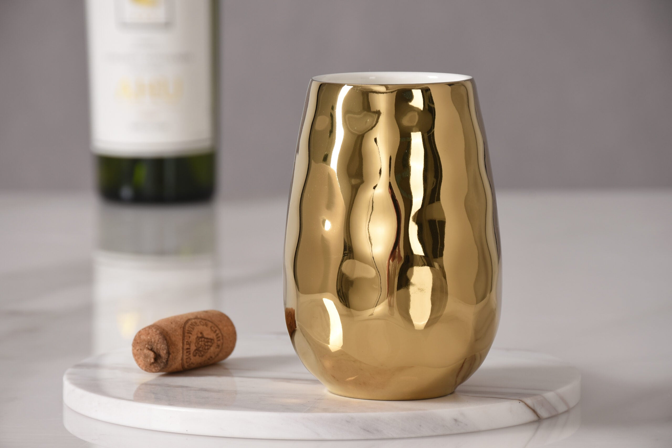 Wine Tumbler from our Accessories Collection. These stemless glasses come in handy for serving everything from wine and cocktails to water. Texture like this on the table makes the mix more fun for your everyday. Handcrafted in striking high-fired white porcelain combine with an elegant metallic gold finished outside. Food safe. Dishwasher safe. Easy Care. Capacity: 12 oz