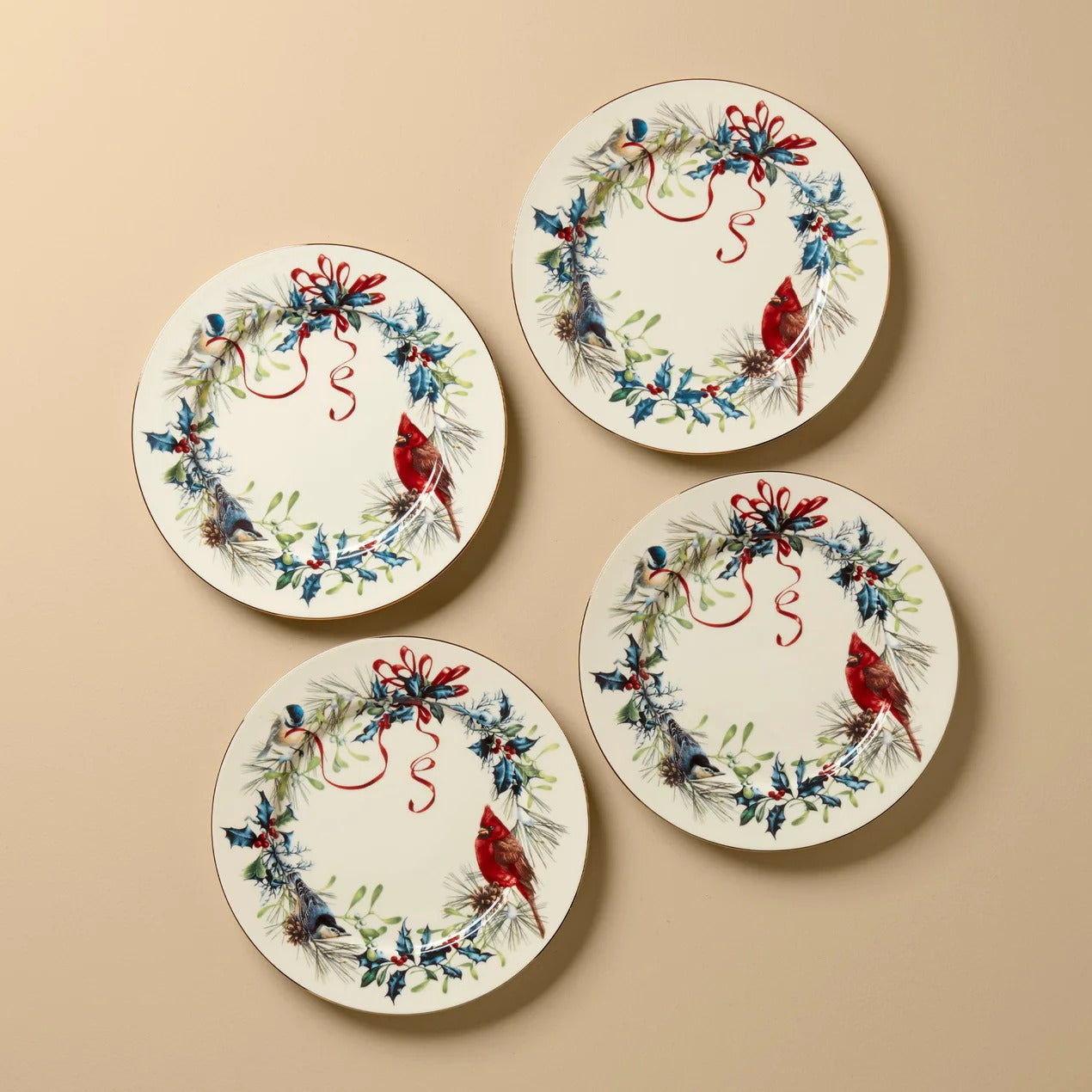Our classic Winter Greetings Collection features peaceful birds perched amidst a motif of pinecone, holly and mistletoe. Crafted from durable porcelain with 24k gold accents, these dinner plates make an artful addition to the holiday tabletop.