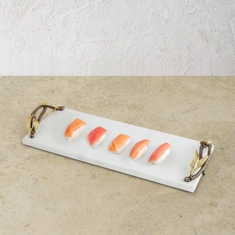 Sculptural and serene, the Zen Garden Sushi Board transforms serving into a luxurious ritual. Handcrafted in cool marble with natural and oxidized brass accents, its minimalist design echoes the raked lines and tranquil beauty of a Japanese Zen garden. A harmonious balance of form and function, it embodies Wabi-Sabi elegance—perfectly imperfect and undeniably refined.